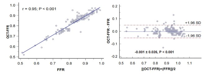 ● Konkordanz: OCT-FFR zeigte eine ausgezeichnete Übereinstimmung mit invasiver FFR. Die Mittelwerte waren identisch (0,85 ± 0,08 für beide Methoden), mit einer starken Korrelation (Pearson r = 0,95, P < 0,001). Die Bland-Altman-Analyse bestätigte weiterhin eine hohe Konsistenz (mittlere Differenz −0,001 ± 0,026, P < 0,001).